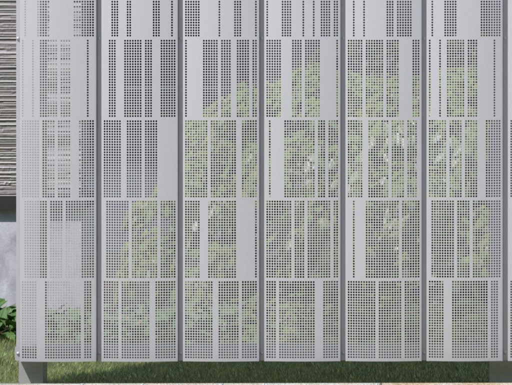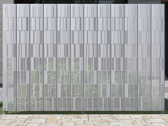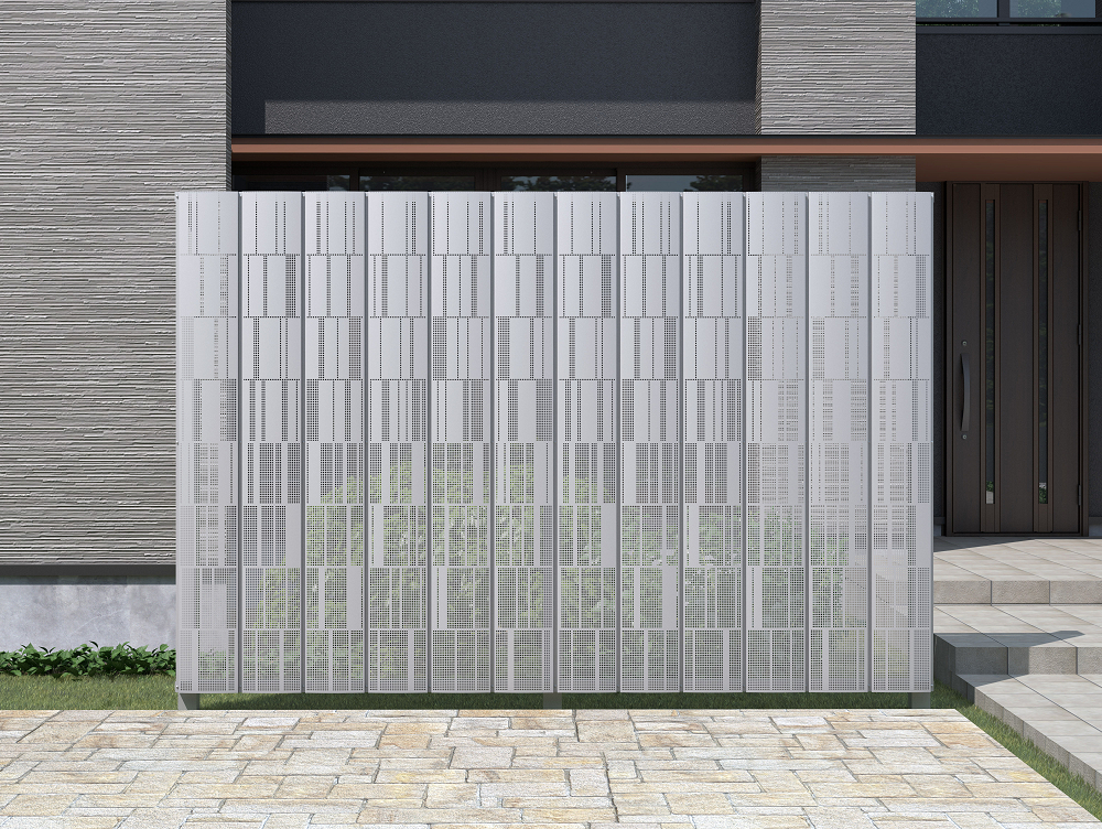 ご好評いただいております『PIANO R7型』の目隠しバージョンです。『BLIND PIANO (ブラインド ピアノ)R11型』。上部が視線を遮る目的で孔が少なく、足元は採光のため孔が多いデザインとなっています。他にはない、デザイン性の高いフェンスをお探しの方へおすすめです。